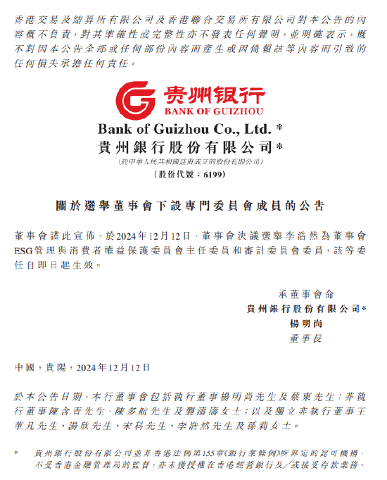12月12日金融一线音书,贵州银行当天发布公告称,于2024年12月12日,董事会有缱绻选举李浩然为董事会ESG处理与破钞者权柄保护委员会主任委员和审计委员会委员,该等委任自即日起见效。