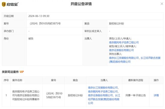据启信宝信息,南京证券新增扫数开庭公告,案由为股权转让纠纷。