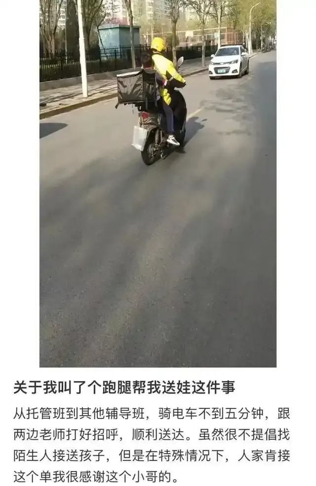 跑腿小哥以“同城帮买帮送工作”,闲适了破钞者个性化需求,匡助破钞者惩处了生计当中的燃眉之急。个别家长却将送物改为送东说念主,因而出现了借助跑腿接送孩子的“业务”。